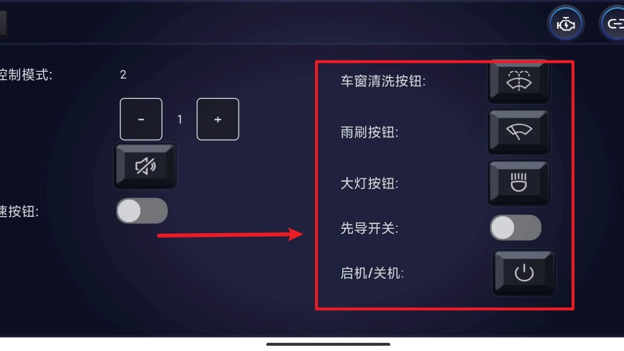 4. 点击右侧各功能按钮可操控雨刷、大灯、电源等关键指令,界面直观一目了然。