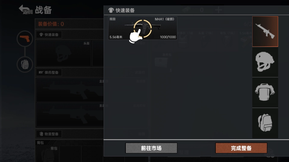 2、战备页点【快速装备】,从仓库择M4A1等,借【整理】理物资。