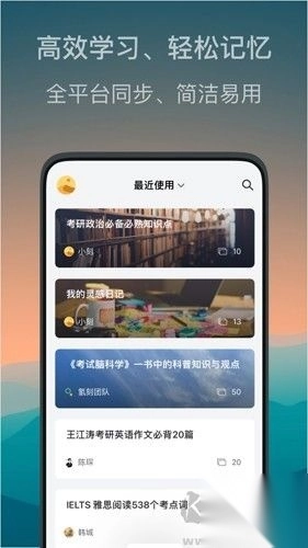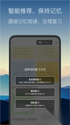 2、借助科学卡片学习:创建涵盖知识、信息等多种类型的卡片,依据学习进度,按照艾宾浩斯遗忘曲线,系统自动推荐复习,有效强化记忆。