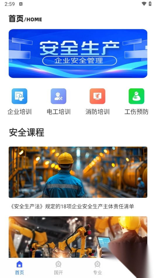 1、首页呈现了企业培训、电工培训、消费培训、工伤预防等相关教学视频,用户通过观看这些视频,能够熟悉培训内容,提前做好预防。同时,页面上还有各类精心整理的安全课程,用户可直接免费学习。