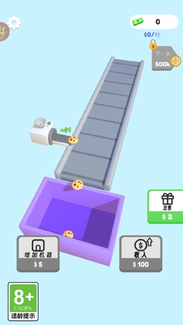 3、点收入,提升每块饼干出售价,或买新机器扩产能。