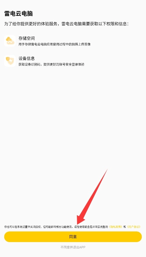1、初次启动雷电云电脑APP时,系统会弹出用户协议与隐私政策,确认无误后点击同意按钮进入下一步。