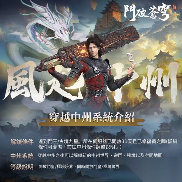 风起中州,解锁新地图,修行者所在服务器开放第31天会自动开启穿越中州系统,4月28日更新维护后,预计5月2日各服将会陆续开放,具体可参照游戏内穿越中州倒计时结束后开启穿越中州系统。