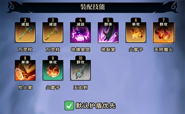 技能搭配:游戏玩法多以挂机为主,所以在选择技能搭配时,应以提升存活率为主要目的。在技能搭配界面,有护盾优先选项,建议尽量开启,该选项在 PVP 和 PVE 场景中都能带来意想不到的效果,可防止角色快速死亡。