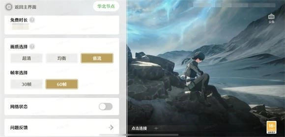 3、本次默认支持30帧/60帧两档帧率设置,画质方面提供超清、均衡、省流三个档位,可根据个人偏好通过游戏内的悬浮球来进行画质的调整。