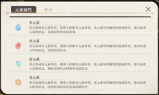 战斗角色依据元素可分为水、火、雷、光、暗这5种类型。战斗过程中会遭遇形形色色的怪物,它们各自拥有不同的元素弱点。玩家可依据怪物的弱点,挑选与之对应的元素角色。不同元素所造成的伤害,还会有各自独特的效果加成。只要弄明白相关的战斗机制,就能在元素配队方面,拥有一定的思考方向。