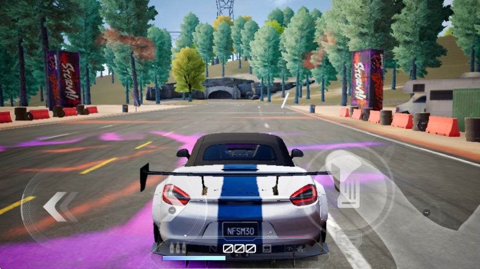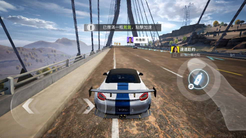 2、右侧是手刹车键,长按方向键并点击刹车键就能实现漂移。漂移不仅能助力快速转向,还能积攒氮气。完成漂移后,要记得及时将方向回正。