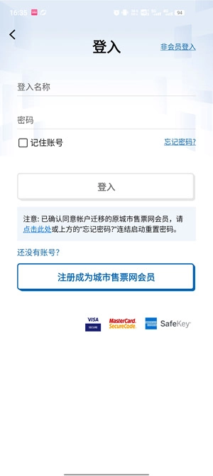 点击右上角人形头像处,进入页面之后,点击登记成为城巿售票网会员,即可进入账号注册页面。(非会员也可以在城市售票网进行网上购票。请先返回主页,选取欲购买的节目场次后,再使用“非会员登入”方式购票。但一般建议注册一个自己的账号,不但可以在账户下查看自己的门票情况,还可以让整个购票流程更顺畅)。