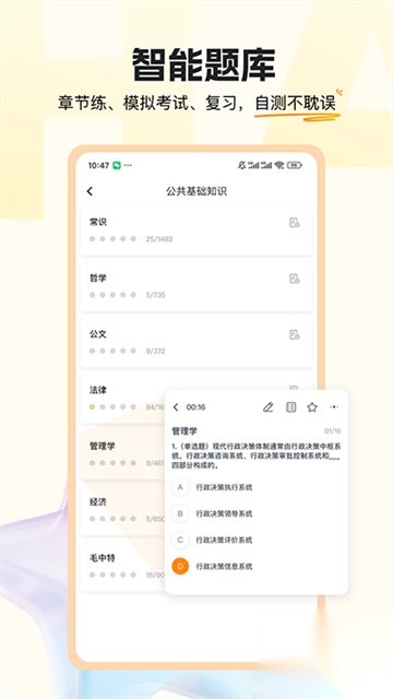 3、【公考必备神器】专门为公务员考生打造的学习平台,不仅能智能推荐学习内容,还能定制专属备考计划。最实用的是自动整理错题本功能,配合阶段性模拟测试,备考效率大大提升。准备公考的朋友们快来体验吧!