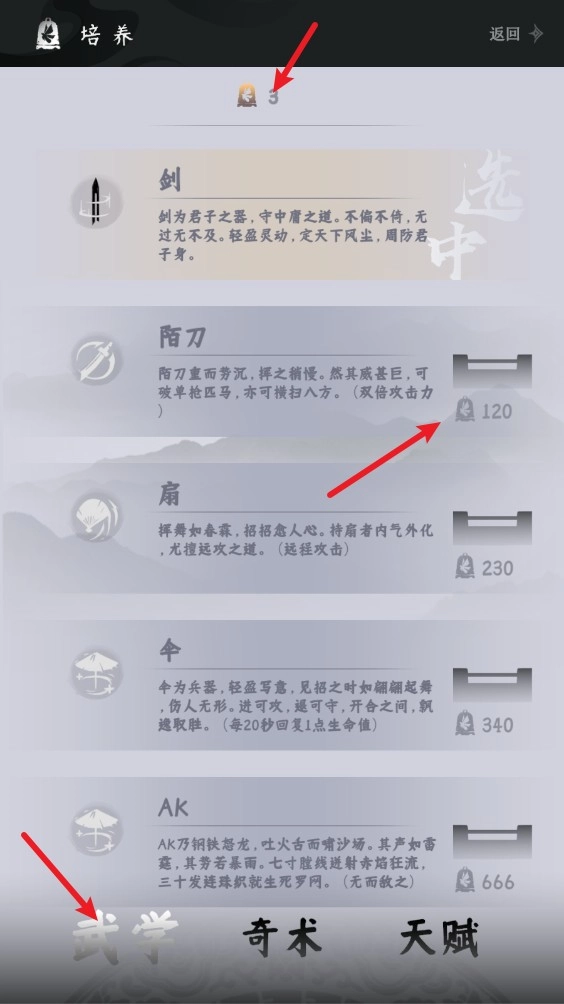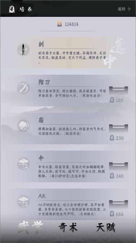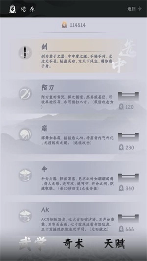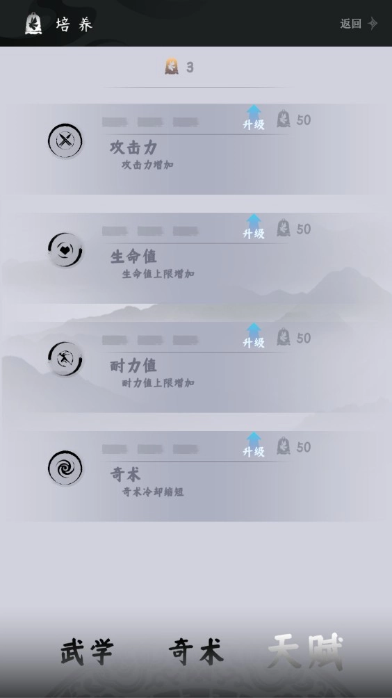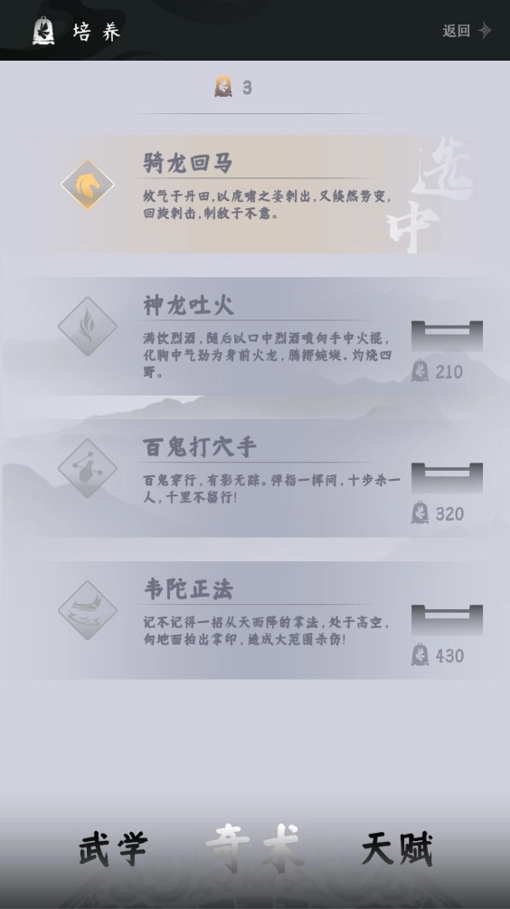 2、点击培养可以消耗获得的金币来解锁新的奇术和武学,还可以对天赋进行升级。
