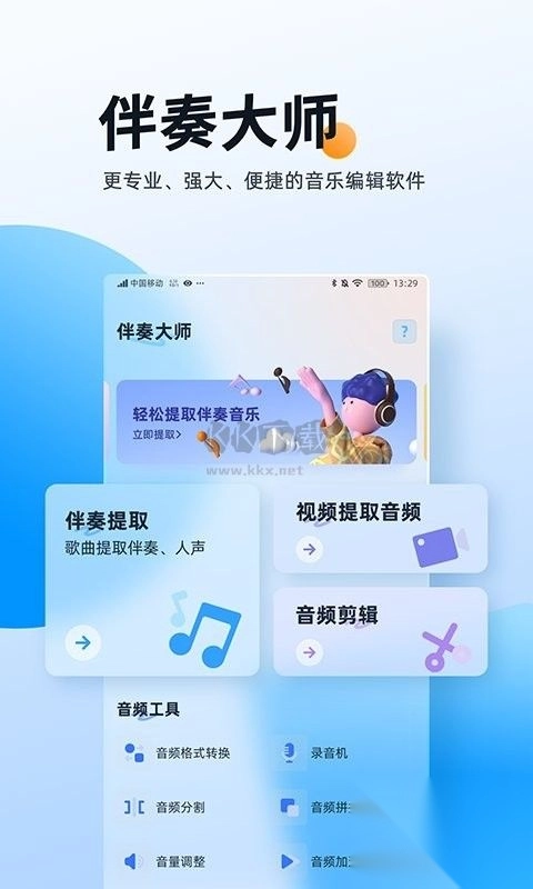 伴奏大师app,一款专业的音频提取与编辑利器。在这里,用户能够轻松从音频中分离人声与伴奏。不仅如此,它还具备丰富多样的音频编辑功能,支持音频的合并拼接操作,让用户能便捷处理各类音频文件。无论是打造超炫的手机铃声,还是制作专业的伴奏音乐,都能轻松实现,带你尽情领略音乐剪辑的乐趣。感兴趣的用户,赶快前往KK下载体验吧!
