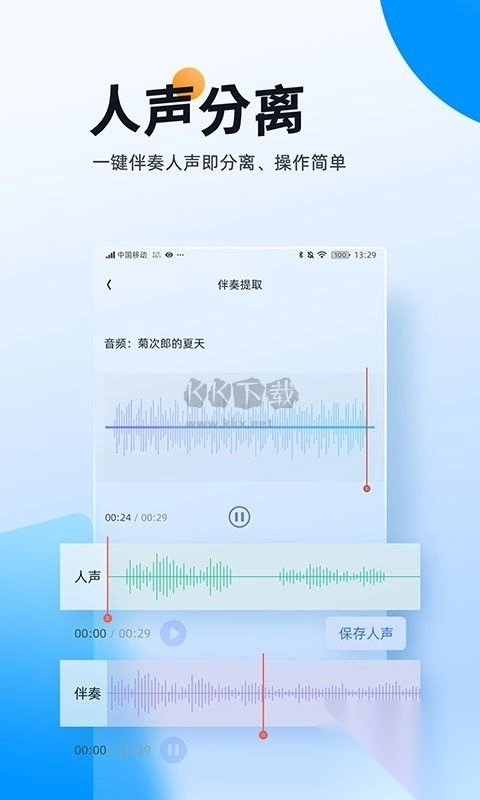 借助人工智能的先进算法,把音频里的人声和背景伴奏进行分离,从而生成两段不一样的音频文件。