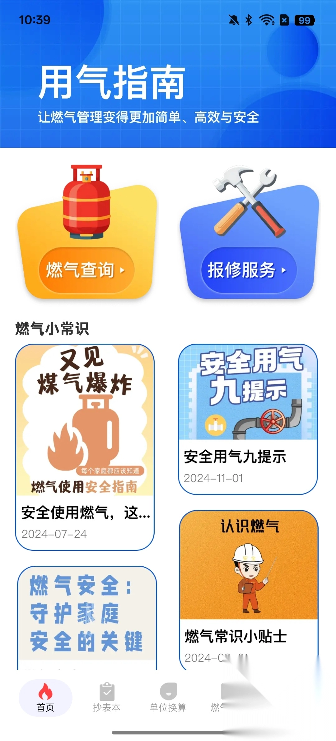 1. 页面显眼位置设有大大的“燃气查询”与“燃气报修”按钮,用户轻点按钮,就能迅速进入查询及报修流程。同时,页面上还包含各类用气小常识。在页面下方,依次排列着“燃气计算”“单位换算”等功能入口。