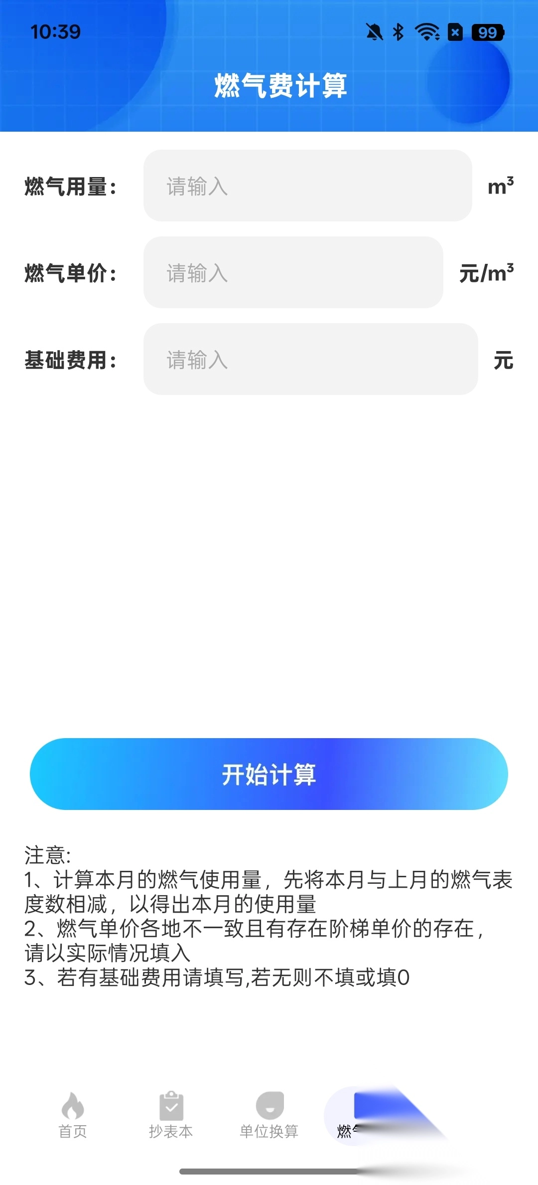 2、燃气计算功能,用户仅需输入燃气用量、燃气单价和基础费用这三项,就能算出用气情况,精准估算燃气消耗。