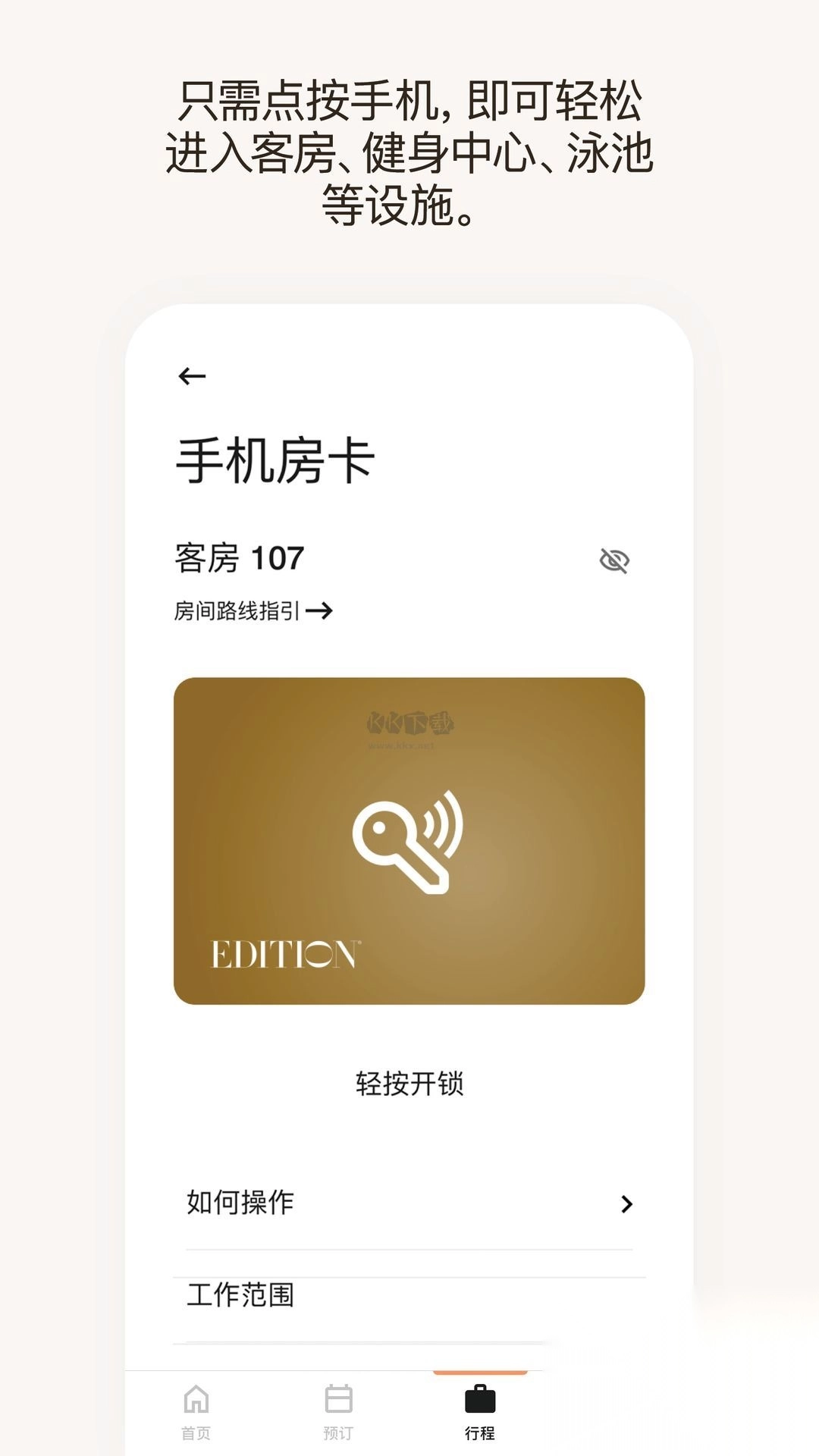 4、手机钥匙:在指定酒店,您能用手机打开房门,还能凭借它探索酒店的其他区域。