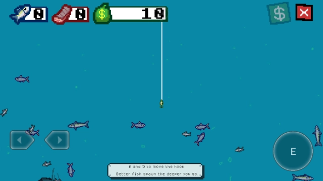 2、走到最左边的钓鱼台处,按下E键开启钓鱼。此时,钓鱼线会自行下落;你可以通过左右方向键操控其方向。让鱼钩碰撞到鱼,对鱼造成伤害,当伤害累积到一定程度,就能把鱼钓上来。