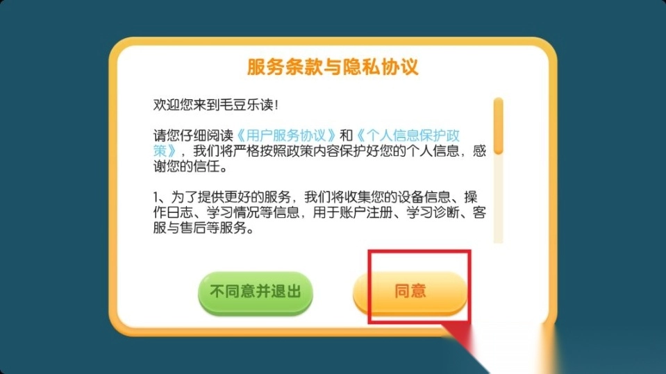开启毛豆乐读app,点击同意相应协议。