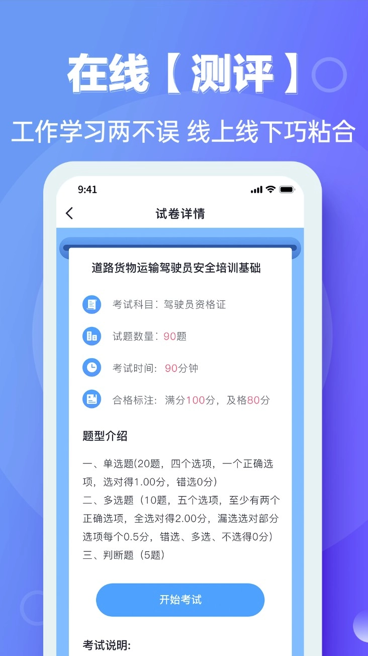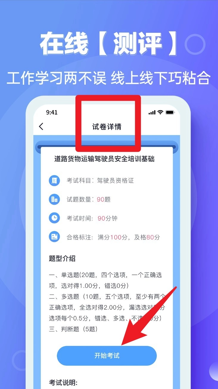 4. 轻点测评模块,即可查看考试详细信息。确认无误后,点击“开始考试”,随即进入作答流程。