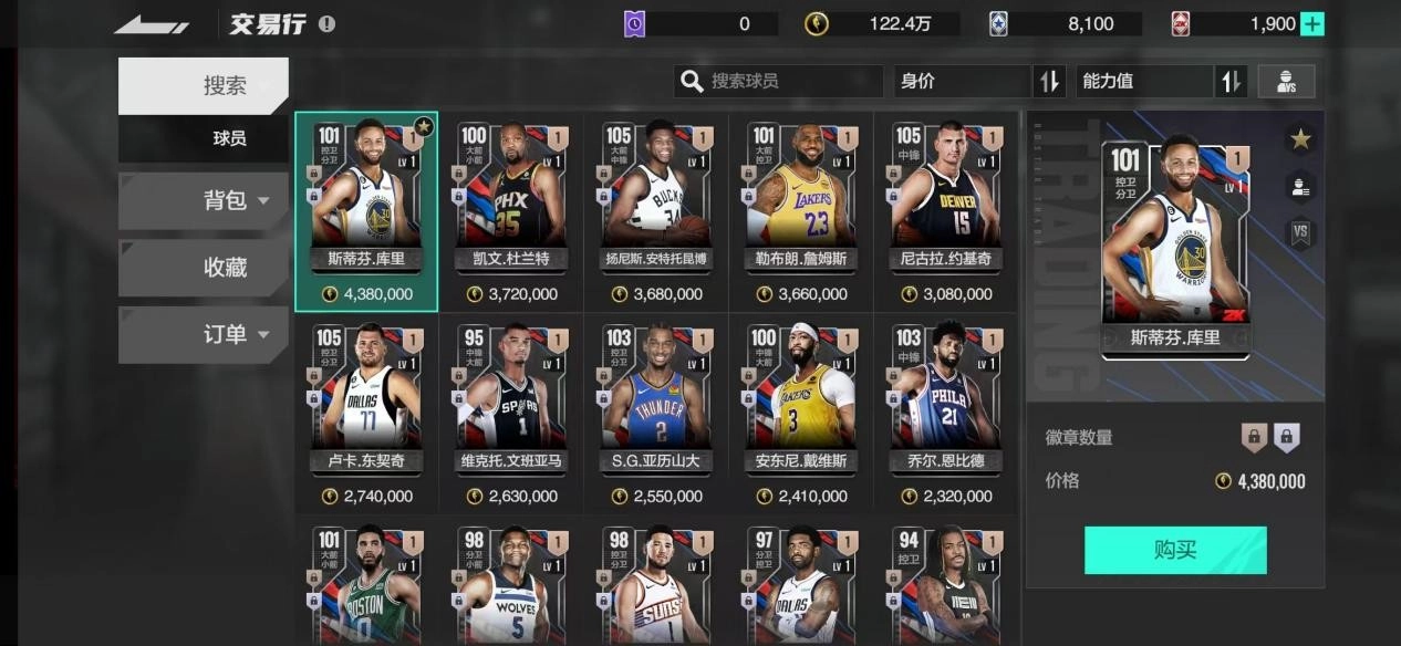 ②在交易市场,你既能够通过搜索栏查看当前正在上架的球员(球员信息实时更新,你还能将心仪的球员收藏起来,便于实时关注),也可以从背包里挑选自己需要的球员,调整好所需数量后点击购买,这样就能完成交易。
