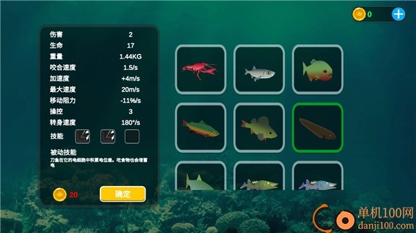 玩家进入游戏可以选择不同的鱼类开始战斗,需要花费金币才能解锁其他鱼类