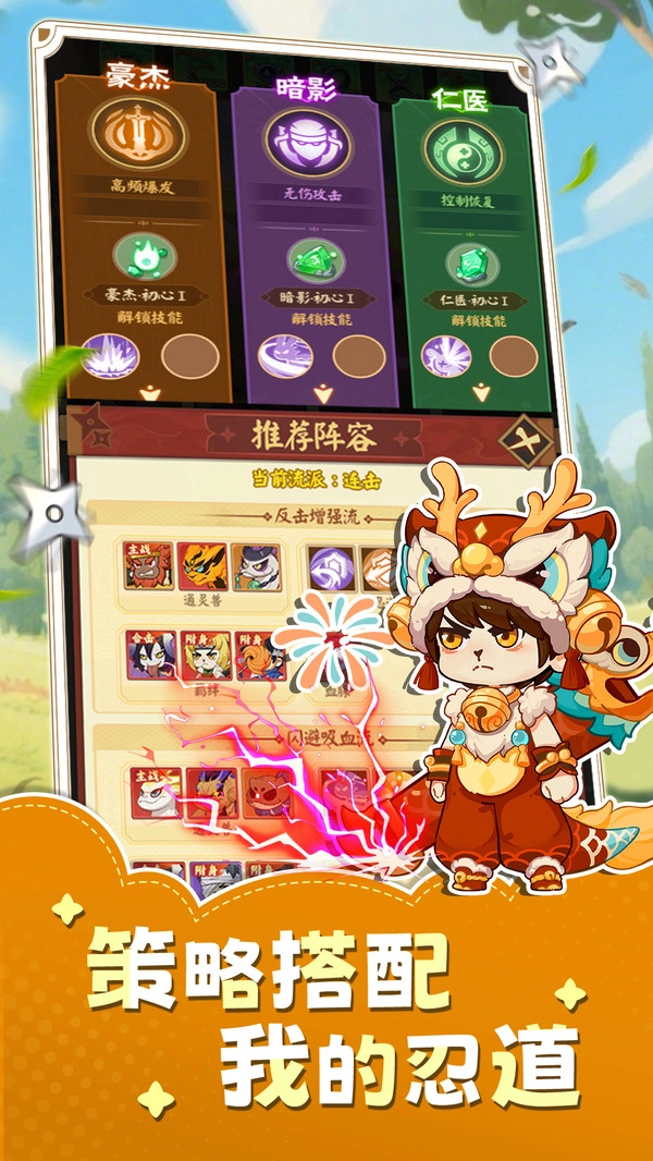 【流派搭配,策略至上】:羁绊英雄、通灵兽组合形成多样流派,不同搭配左右战斗局势,百变阵容彼此制衡,平凡玩家也能逆袭,你定能成为最强兔忍!