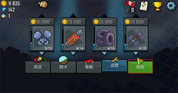 3、升级部件包括发动机、悬浮、轮胎和四轮驱动