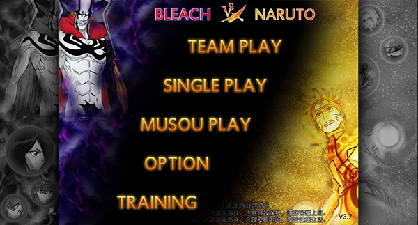 1. 开启《死神vs火影》,进入玩法选择模式,其中包含小队模式(TEAM PLAY)、单人模式(SINGLE PLAY)、无双模式(MUSOU PLAY) 。