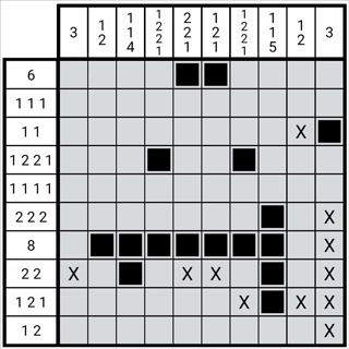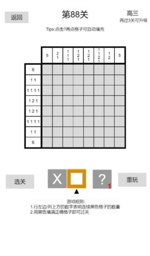 数字的确切位置,通常能依据一排的格数与数字推导得出,偶尔也会用到已经确定的正格和负格,仅有极个别关卡需同时借助两排以上的信息。这就使得该内容的难度并非特别高,本系列旨在助力您从初入门槛的新手,快速成长为能够推理大多数图形的高手。
