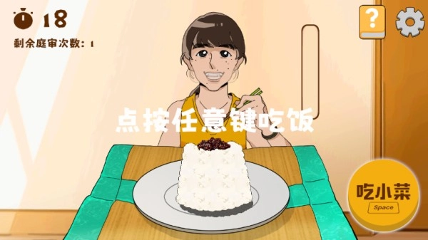 4、玩家需在规定时间内吃完米饭。要留意,干饭速度过快会引发晕碳。若停止干饭,晕碳值会降低,而吃小菜能让晕碳状态暂停2秒。一旦处于晕碳状态,就会触发庭审。