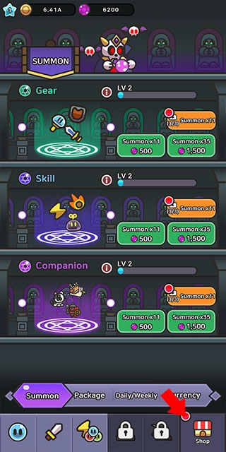 3、若要获取装备,可点击右下角进入商店界面。在该界面中,第一个池子是装备池,第二个是技能池,第三个是宠物池,各位按需抽取就行。