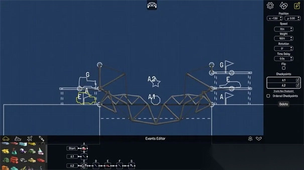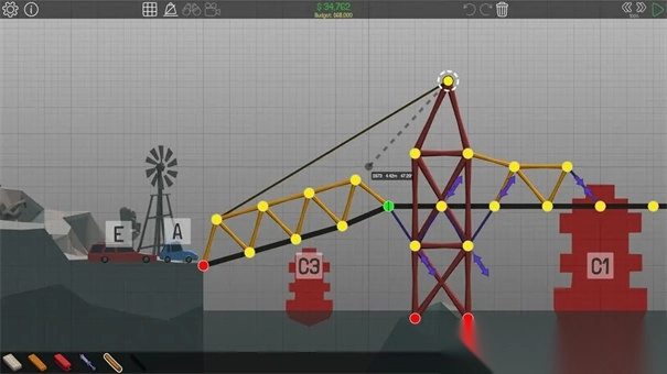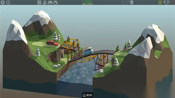 1、玩家需根据关卡需求,用最少的预算建造结构稳定的桥梁。