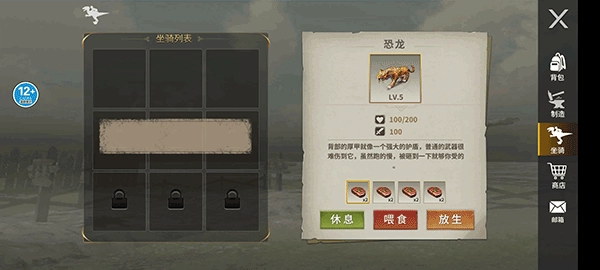3、恐龙驯养要定时喂食:恐龙坐骑每日需喂养,注意驯服后管理好宠物。