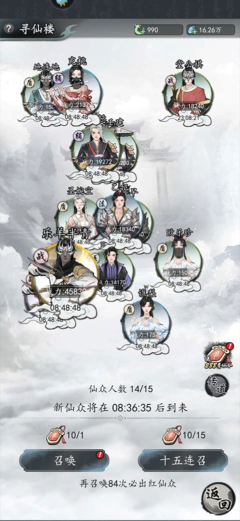 4、寻楼招募仙众,若招募到不满意的仙众,可进行传道操作。传道后,该仙众会消失,但能获得对应的仙众之魂。仙众之魂可用于仙众进阶,助力角色战力大幅提升。