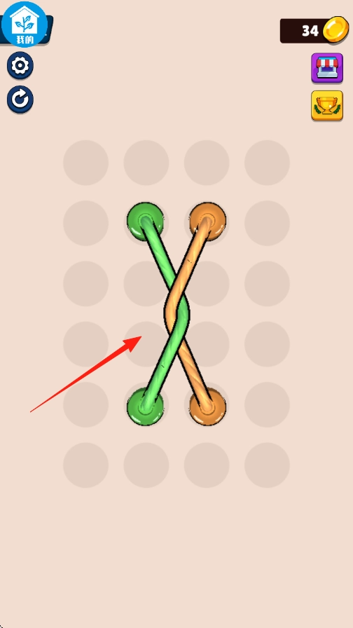 1、进入游戏到主界面上,观察交错的绳索如红绿两根绳索交叉,明确目标是解开它们。