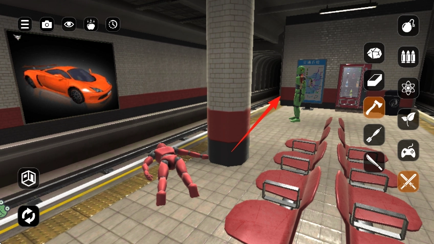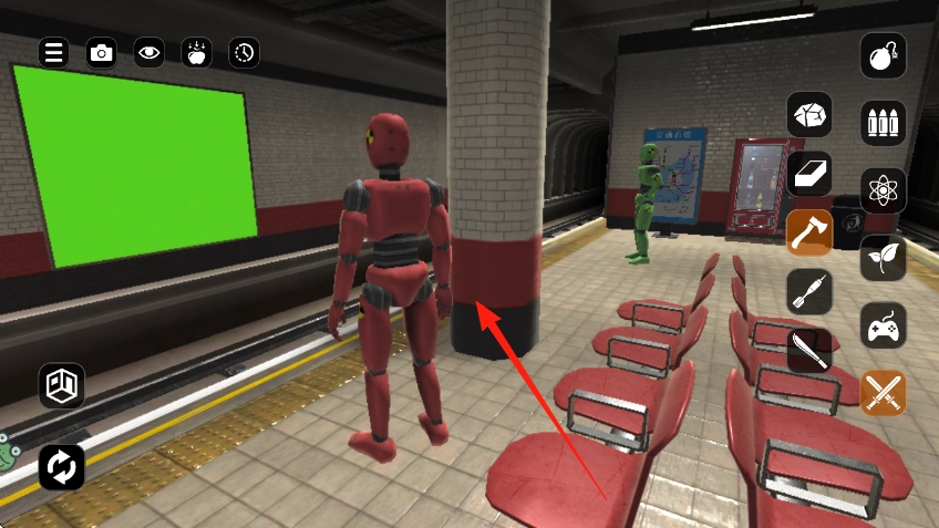 1、进入地铁站场景,屏幕右侧有各类道具图标如红箭头所指的锤子,点击选择道具来武装自己。