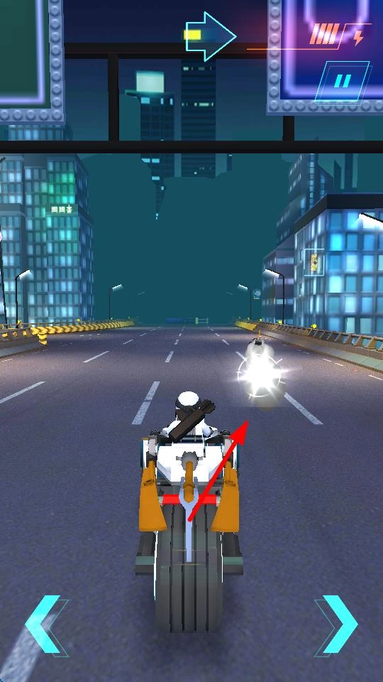 2、骑行过程中通过倾斜屏幕控制摩托车转向,点击右侧屏幕加速、左侧屏幕刹车,灵活躲避路上的障碍物与其他车手。