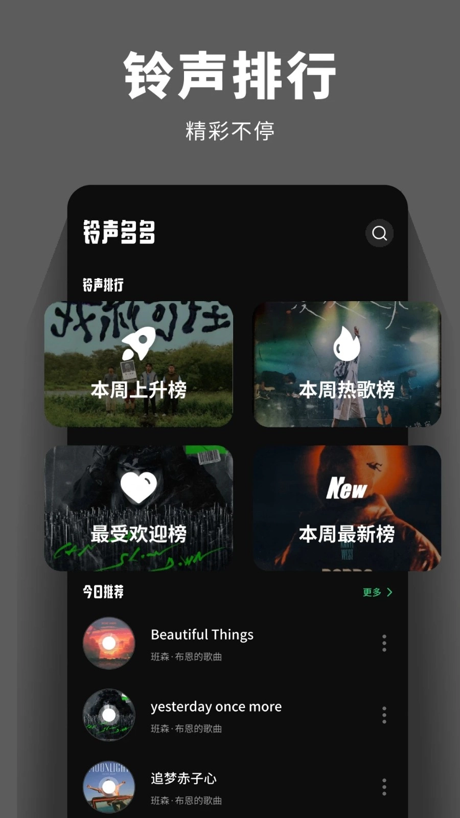 3、铃声库实时更新,紧密追踪潮流热点,定期增添新颖铃声资源,让用户时刻引领时尚,不错过任何流行元素。