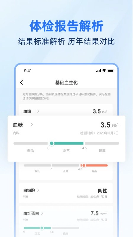 【健康档案】可直观呈现您历年来全部的体检结果数据,通过展示历年检查数据,呈现出相应的变化趋势,并对您可能面临的潜在疾病风险予以预测。