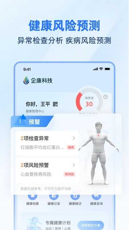 企康云app官方手机端的最新版本,全方位为您的健康保驾护航。在这里,您不仅能查阅详尽的体检报告,其中异常项目会得到重点解析;还能依据检查结果预测疾病风险,查看各方面详细的评估数据。并且,系统会根据这些数据为您量身定制对应的健康计划。