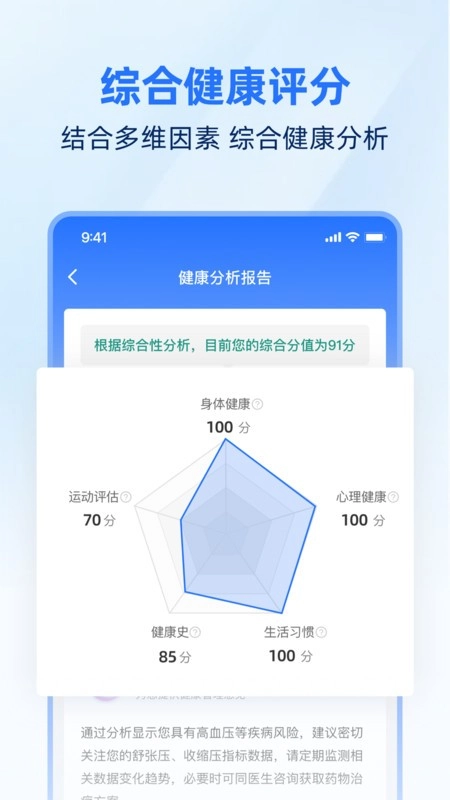 【健康评分】可依据您的生活习惯、体检报告、健康史、档案史以及心理测评结果等,对您的健康程度展开综合性评分,助力您更深入地了解自身健康状况。