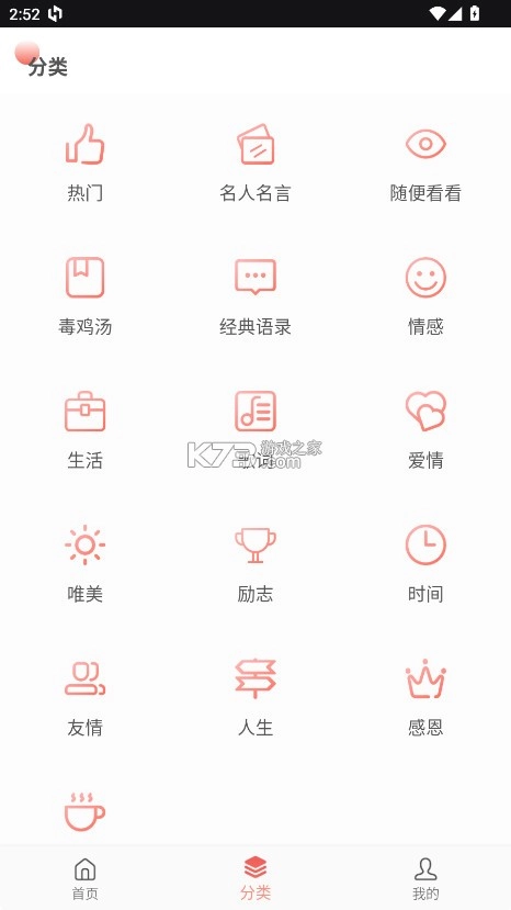 分类浏览:除每日推荐外,用户还能依据类别(诸如爱情、成功、友谊等)浏览以往的名言集锦。