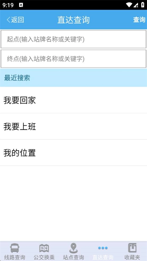 2、进入【公交换乘】界面,分别输入起点和终点位置,然后点击右上角的查询按钮即可。