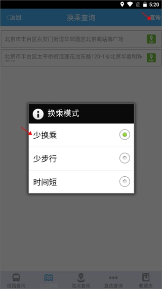 4、在输入出发地与目的地后,点击查询,接下来便要依据自身需求,选择换乘模式。