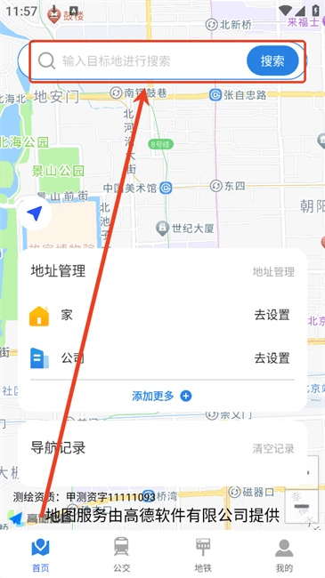 3. 随后能够依据自身需求,在基本导航、公交或地铁功能中进行选择。在此,我们以基本导航为例,进入【首页】后,点击上方的搜索框。