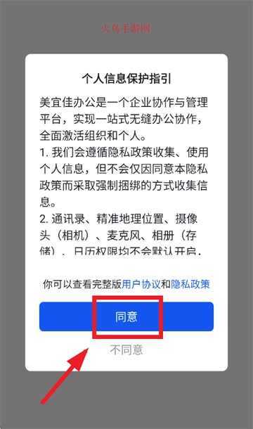 下载安装并打开美宜佳办公app,先同意个人信息保护指引
