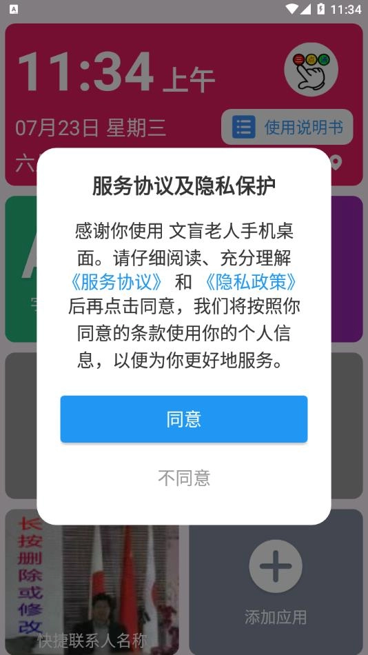 1、下载安装软件后打开,点击同意弹出的服务协议及隐私保护。