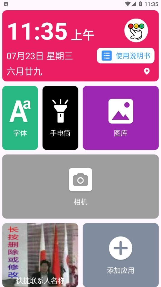 文盲老人手机桌面APP,专为不识字老人打造,助其轻松玩转手机。它能助力老年人便捷实现打电话、视频聊天、拍照、开启手电筒等日常操作,极大降低使用难度。同时,软件配备详细使用说明书,并提供灵活的桌面自定义功能,充分满足老年人个性化使用需求,让老人简简单单就能流畅操作手机。
