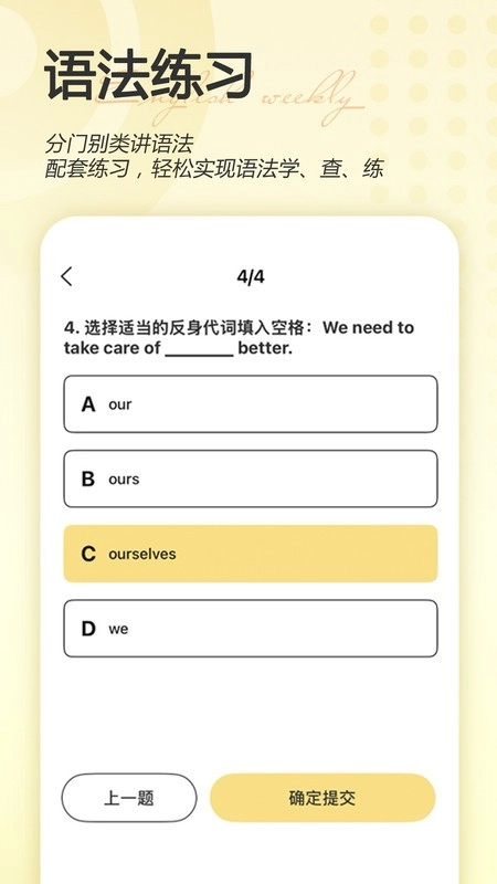 语法教学——采用分门别类的方式讲解语法知识,并配备相应练习,让你轻松实现语法的查询、学习与练习。掌握语法,就等于掌握了英语学习的关键密码。