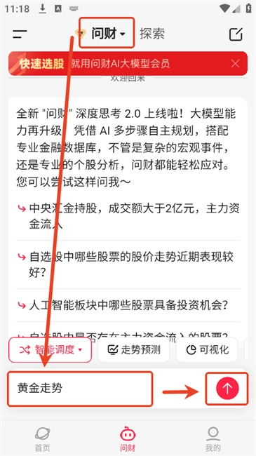 1. 打开软件,点击【问财】。选中【问财】后,在下方的搜索框内输入想要查找的内容,然后点击发送。