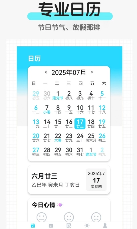 省心日历App,一款布局简约的手机日历软件,能让你快速查询日期信息。通过它,我们可直观知晓每日对应的宜忌,轻松筛选各类好日子,一键浏览便能清楚每月有无法定假期安排。此外,该平台还提供行程管理服务,你能依据个人时间安排,在日历上添加各类行程,到点会有提醒,防止遗忘。